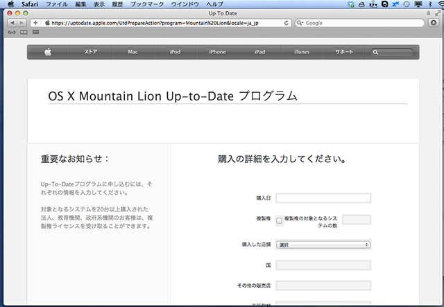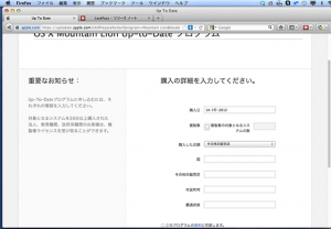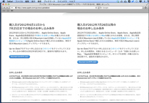 7/25にダウンロードできるようになったマウンテンライオンなんですが、MacBookAirが、無料のUp-to-Dateプログラム対象になっていたので、早速申し込んでみました・・・・